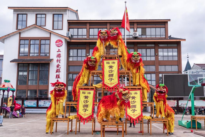 8月31日,浙江省台州市临海市白水洋镇上游村狮子班正在表演国家级非物质文化遗产狮舞(黄沙狮子)。新华网 钟奕 摄
