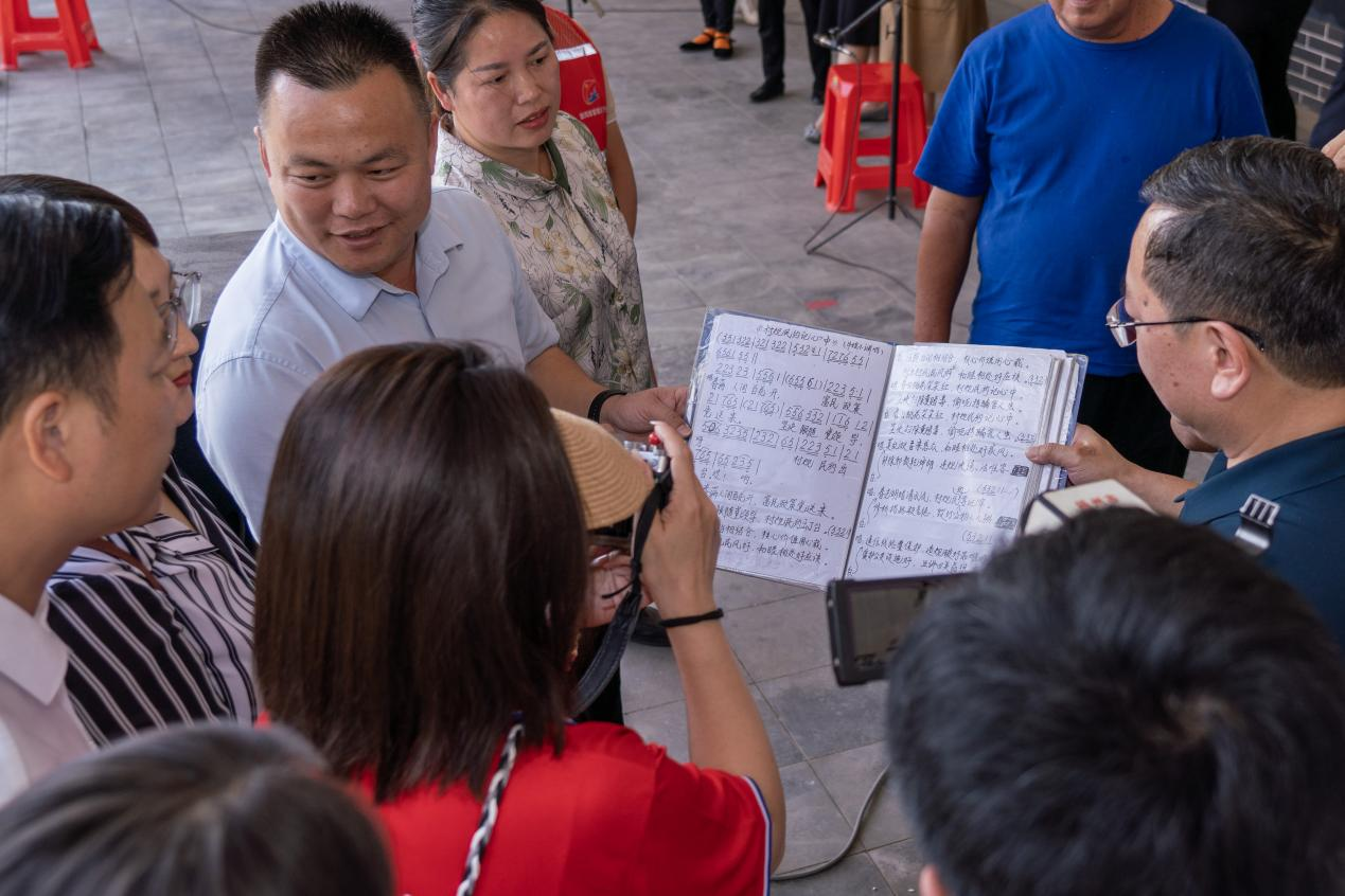 11月1日,广西梧州市岑溪市糯垌镇绿云村的村委会干部展示群众自编牛娘戏的唱词。新华网 钟奕 摄