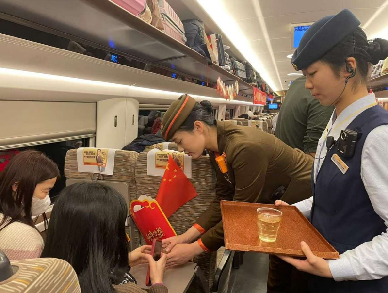 荆荆高铁在2024年12月8日正式开通运营后,串联起沪汉蓉铁路大通道,让荆门市融入全国高铁网络。2025年春运期间,荆荆高铁为返乡务工人员开辟了更为快捷的出行通道。为给返乡人员提供温馨的出行环境,中国铁路武汉局集团有限公司武汉客运段乘务组用红红的福字窗花装扮车厢,给务工人员送上热水,用周到的服务迎接湖北老乡回家过年。