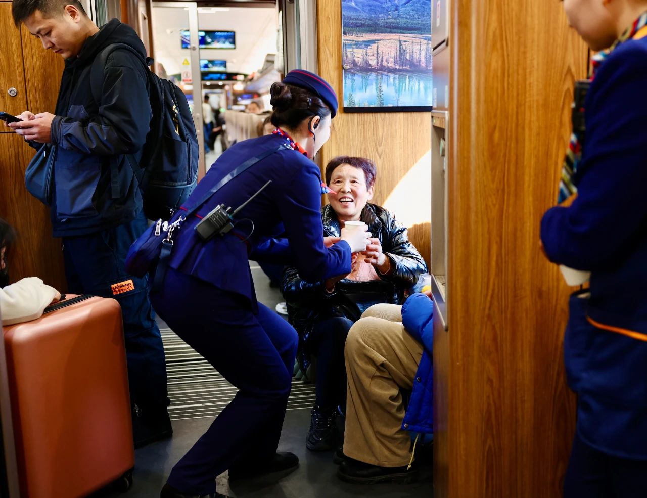 在G809次列车上,列车员为过道上无座乘客奉上热水,让乘客感到了铁路人的热情。