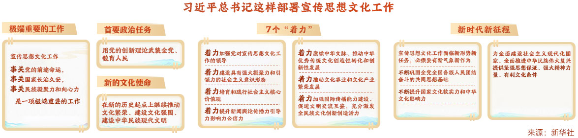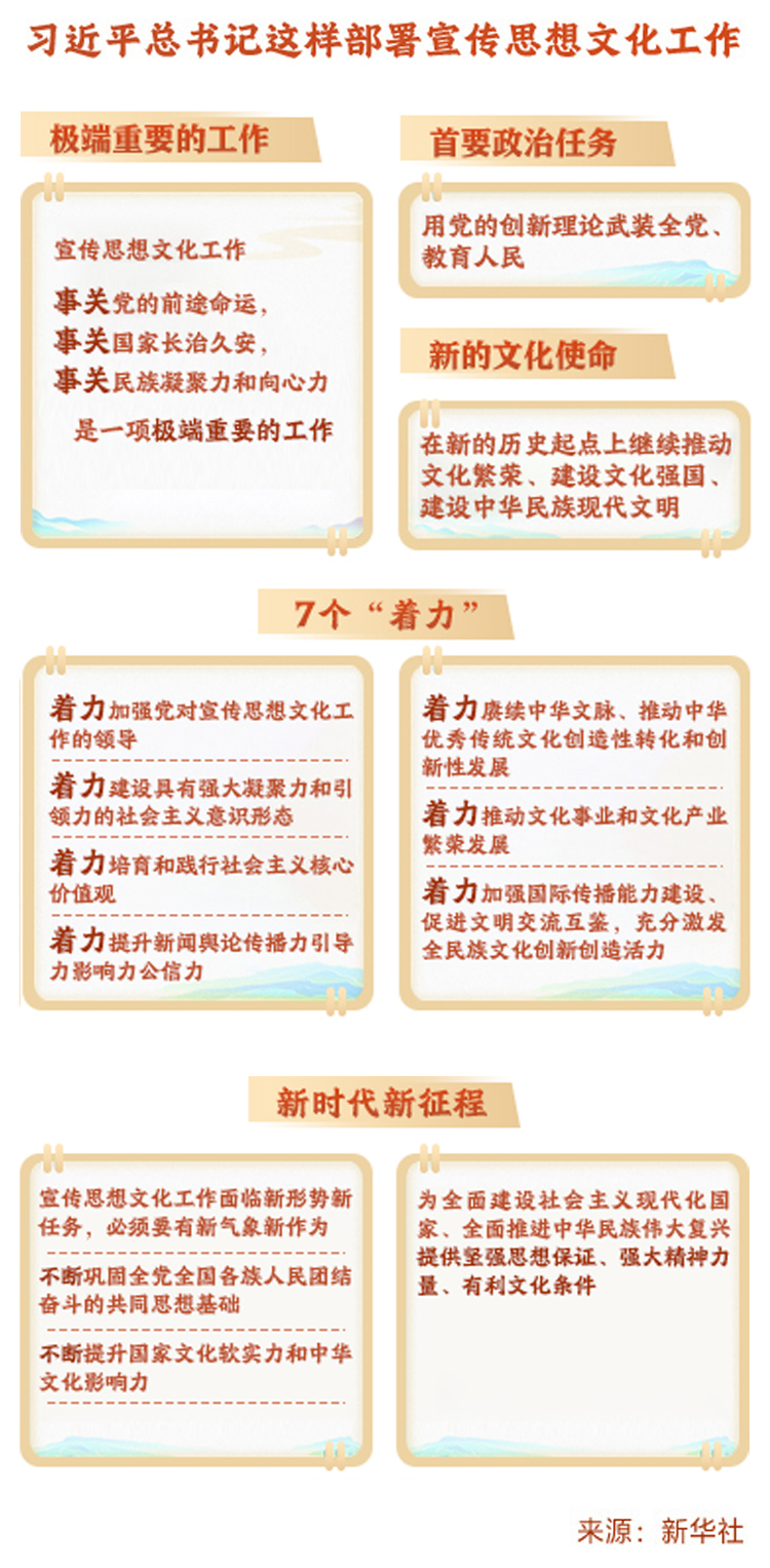 10月7日至8日,全國宣傳思想文化工作會議在京召開。會議傳達(dá)了習(xí)近平總書記對宣傳思想文化工作的重要指示,并首次提出習(xí)近平文化思想。習(xí)近平:堅定文化自信秉持開放包容堅持守正創(chuàng)新 為全面建設(shè)社會主義現(xiàn)代化國家全面推進(jìn)中華民族偉大復(fù)興提供堅強(qiáng)思想保證強(qiáng)大精神力量有利文化條件。